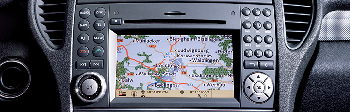 The optionally available COMAND APS control and display system (standard in SLK 55 AMG) not only guides you to your destination, it entertains you as you go. The innovative multimedia system features a hard-disk navigation system plus an integral radio and DVD player and a MUSIC REGISTER with 4 GB of hard disk space for compressed audio files. It also lets you operate the optional Harman Kardon Logic 7® surround sound system with Dolby® Digital 5.1/DTS and 500 watts of output, the DVD changer and the telephone – with the option of voice control. A Bluetooth hands-free system is standard equipment on board and also already comes as standard in conjunction with the Audio 20 CD and Audio 50 APS systems.
